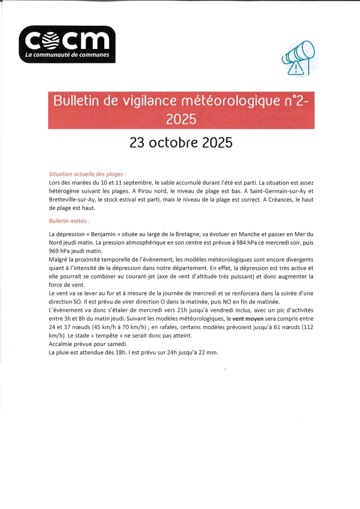 La Dépression "Benjamin" devrait se faire ressentir du Mercredi 22 octobre 2025 à 21 heures au Vendredi 24 octobre 2025 minuit inclus.